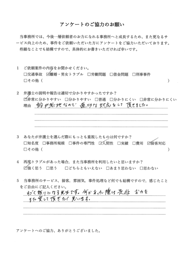 □知名度 □事務所規模 □事件の専門性 ■人間性 □実績 ■費用 ■接客対応